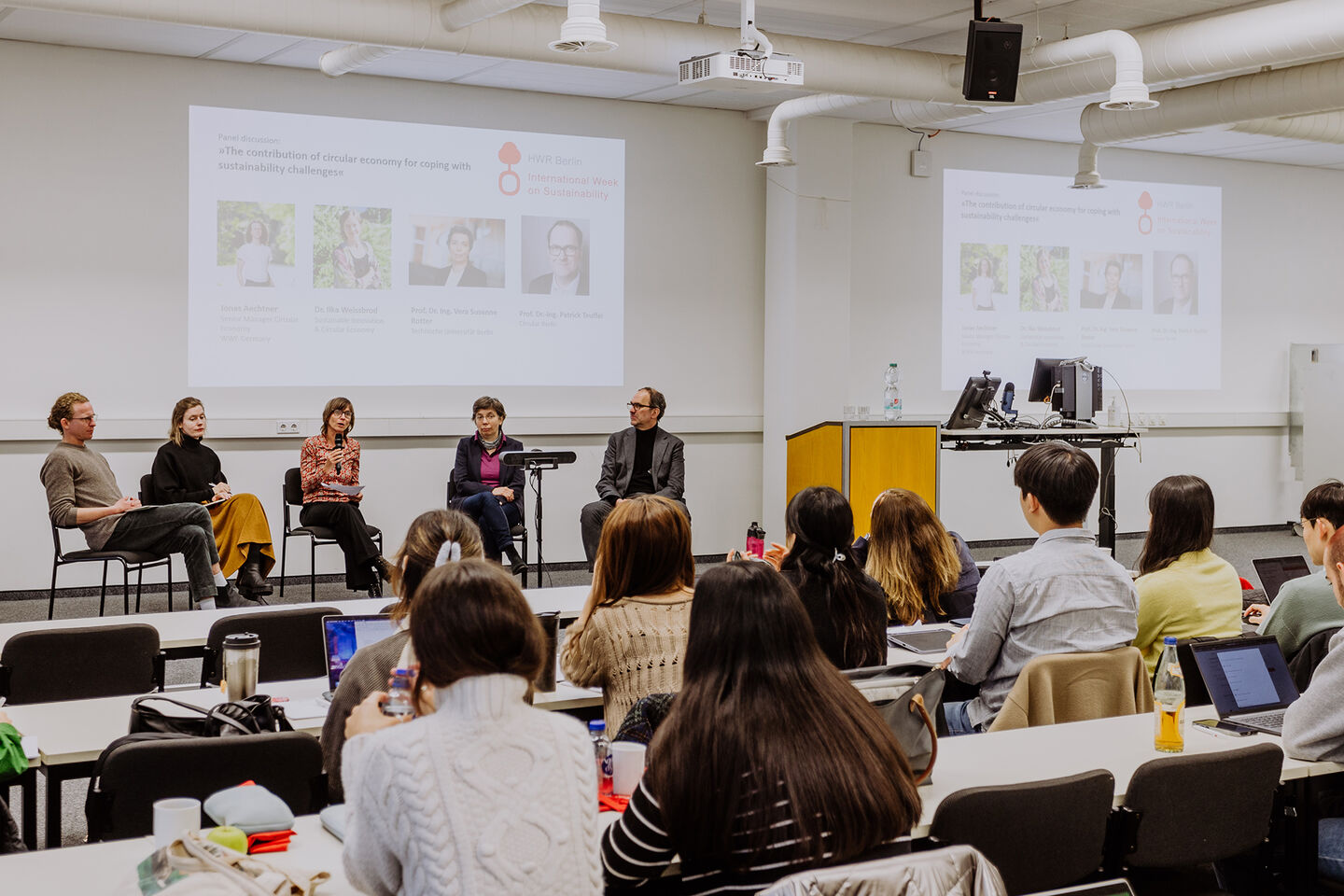 Über 50 Studierende aus 9 Ländern, darunter Südkorea, Großbritannien, Finnland, Spanien und den Niederlanden, haben an der diesjährigen International Week on Sustainability teilgenommen. Dem Schwerpunktthema widmete sich auch die Eröffnungsveranstaltung am 3. November unter dem Titel: „The contribution of circular economy for coping with sustainability challenges“. Nach einer Begrüßung durch Prof. Dr. Andreas Zaby, dem Präsidenten der HWR Berlin und Frau Prof. Dr. Silke Bustamante, der Vizepräsidentin für Nachhaltigkeit fanden vier kurze Vorträge von Prof. Dr. Vera Susanne Rotter (TU Berlin), Dr. Ilka Weissbrod (TU Dresden), Jonas Aechtner (WWF Germany) und Prof. Dr.-Ing. Patrick Teuffel (Circular Berlin) statt. Im Anschluss führten die Vortragenden eine spannende Podiumsdiskussion mit Frau Prof. Dr. Silke Bustamante.