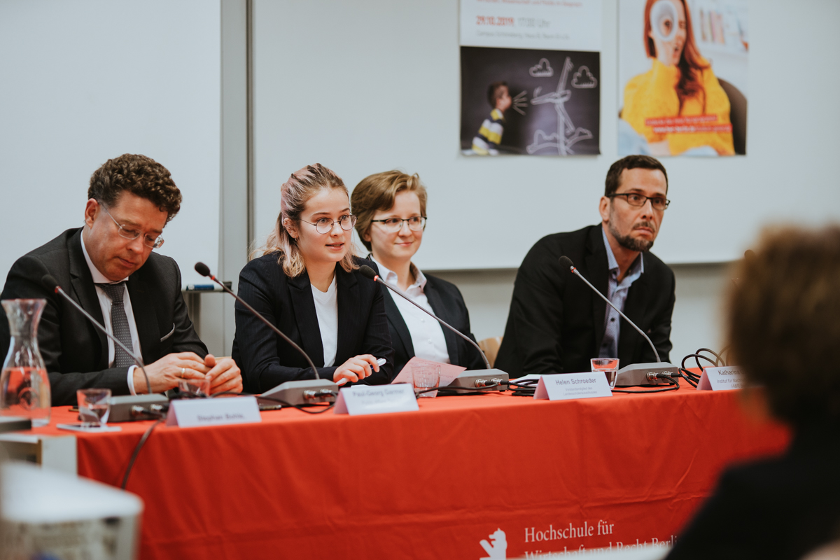 Als Vertreterin der jungen Generation saß Helen Schroeder auf dem Podium. Die Schülerin des Berliner Beethoven-Gymnasiums ist Mitglied im Vorstand des Landesschülerausschusses. Ihre Schule kooperiert mit der HWR Berlin. „Klimaschutz ist so unfassbar unattraktiv, weil Politikerinnen und Politiker ihre Wiederwahl nicht gefährden wollen“, kritisierte sie.